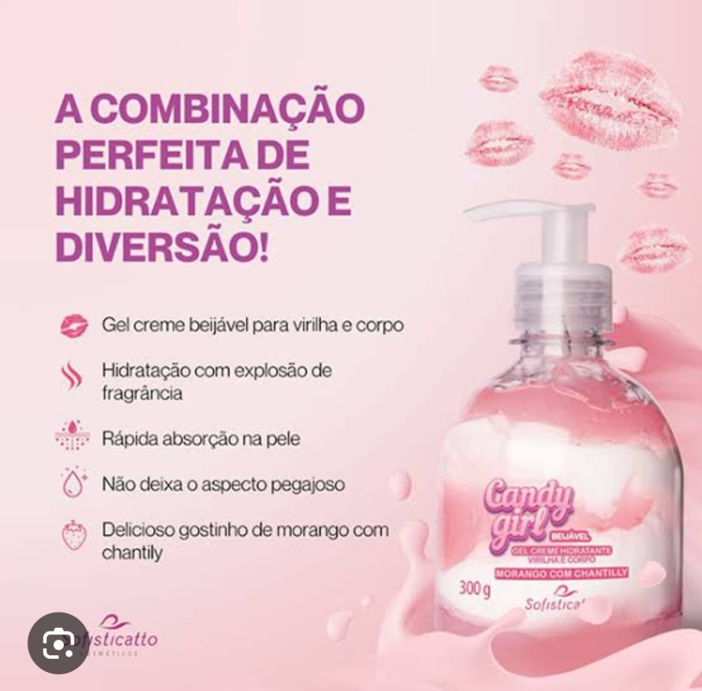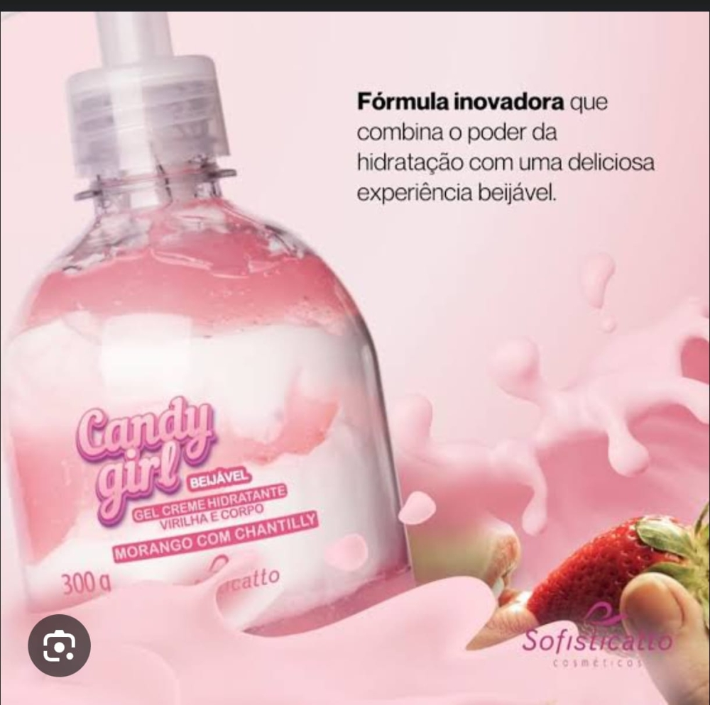 • Contém: 01 Candy Girl Hidratante Beijável para Virilha e Corpo 300g Sofisticatto; • Aroma e Sabor: Morango com Chantilly; • Uso: Hidratante Beijável para Virilha e Corpo; • Indicação: Uso externo; • Validade: Presente na embalagem.